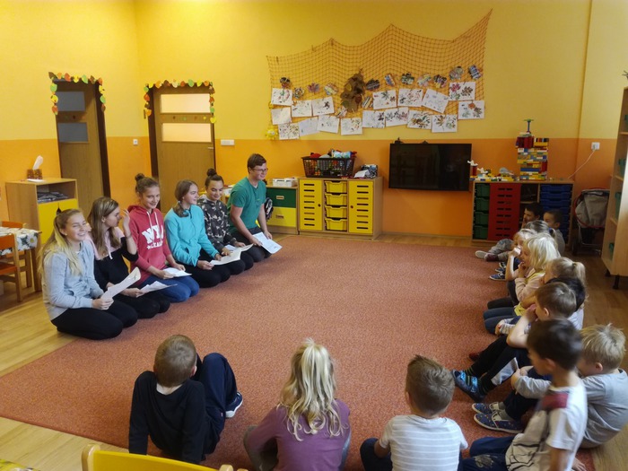 Žáci 9. třídy v rámci projektu "Čteme dětem z MŠ" reprodukovali předškolákům pohádku O Smolíčkovi.